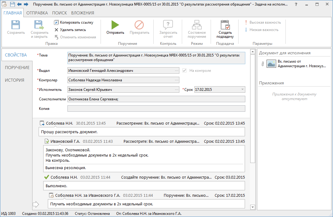 После старта поручения указанный исполнитель получает задание с назначенным сроком. При необходимости инициатор может запросить у исполнителя отчет, продлить срок поручения или прекратить его.